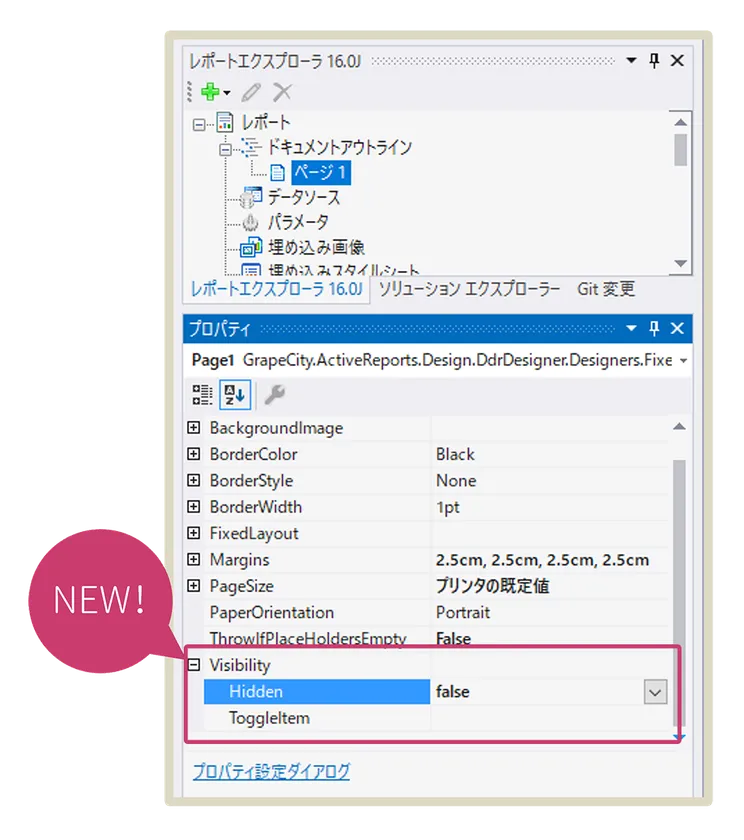 ページレポートのページオブジェクトに「Visibility.Hidden」プロパティが追加され、ページの表示/非表示を制御できるようになりました。「式」を併用することで条件に応じてページの表示有無を制御できます。