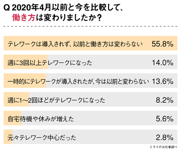 「週に3回以上テレワークになった」とテレワーク中心の働き方ができている人は、わずか14%でした。