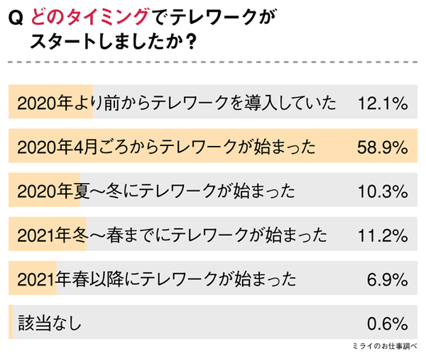 さらに、どのタイミングでテレワークが導入されたのかについてもリサーチを行いました。