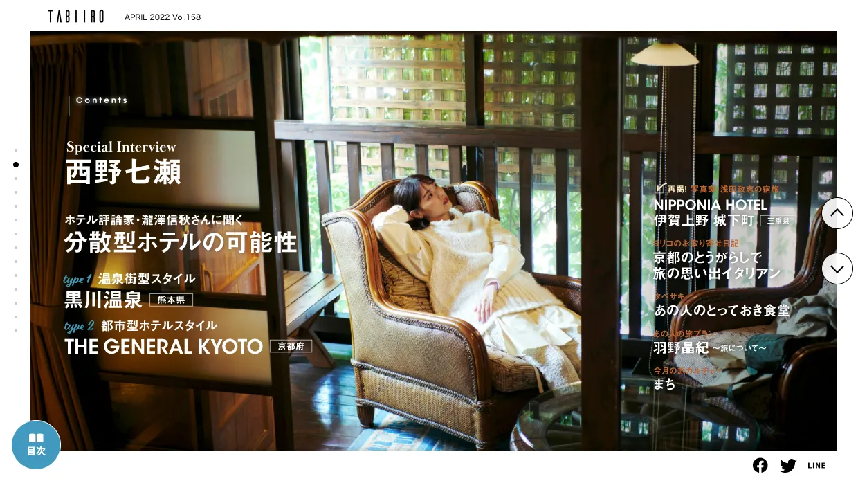 株式会社ブランジスタメディアは、表紙・巻頭に西野七瀬さんを迎え、分散型ホテルを特集した電子雑誌「月刊 旅色」2022年4月号を本日公開しました。竹中直人さんをはじめ5人の食通にとっておきの食堂を教えてもらう特集や、羽野晶紀さんがプライベート写真を交えておすすめの旅を紹介する連載も掲載しています。