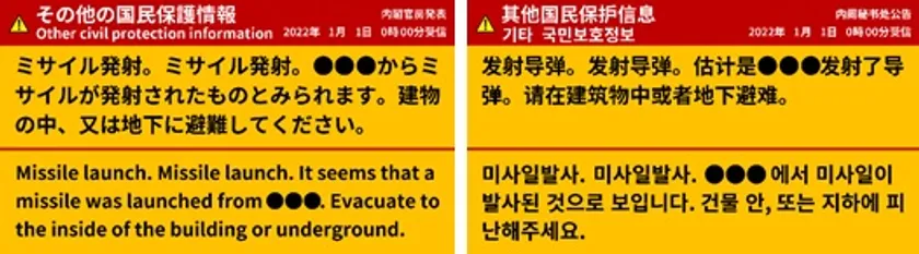 発信するJアラート情報については、日本人だけでなく、都市へ来訪する外国人に対しても、多言語放映を行います。多言語放映については、日本語を含む、英語、中国語(簡体字)、韓国語の4か国語表記で対応します。