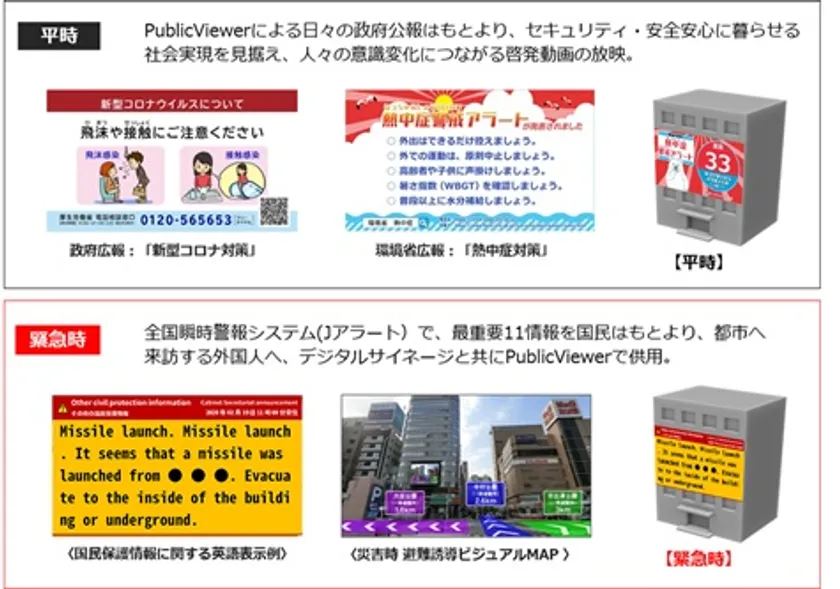 この度、大型ビジョンが設置された地区で災害情報伝達法人としての役割を果すべく、消防庁とJPVAが「災害情報の伝達に関する協定」を締結し、JPVA加盟事業者は、Jアラートを通じて提供される情報(以下、Jアラート情報)について、主要都市部のランドマークとなる大型ビジョンへ自動配信する設備を整えました。このことにより、今までJアラート情報を利用しにくかった市街地屋外メディアでも、その情報を容易に利用できるようになり、人々の安全を脅かす緊急情報を都市、観光地、大規模施設等で遭遇した国民に瞬時に伝達する事が可能となりました。
