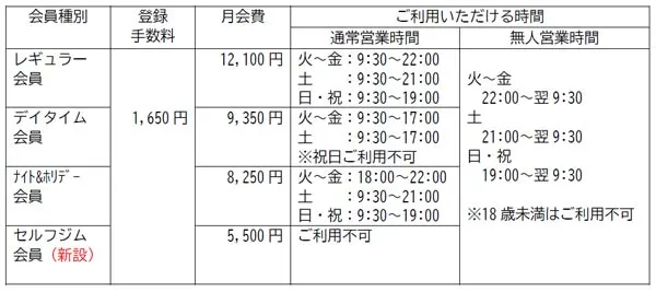 通常営業時間内でのご利用に加え、通常営業終了から翌朝開館するまでの時間に、ジムエリアのセルフ利用ができるようになります。また、新たにセルフジム時間のみ利用できる会員種別を設置します。