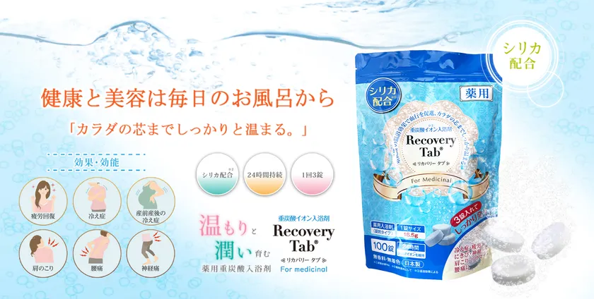 ・薬用Recovery Tabは、ご自宅で毎日の重炭酸入浴を可能とした医薬部外品の入浴剤です。入浴による温浴効果で血行を促進し、疲労回復、腰痛、肩こり、冷え症などのつらい症状をやわらげます。