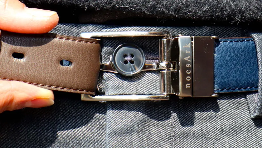 日本で特許査定済、国際特許出願中のベルトピンにズボンのボタンを引っ掛けることで、バックル部分が上左右にズレることを防止することができる、ベルトのズレ防止機能『ZUREN』を搭載した特別なベルト。