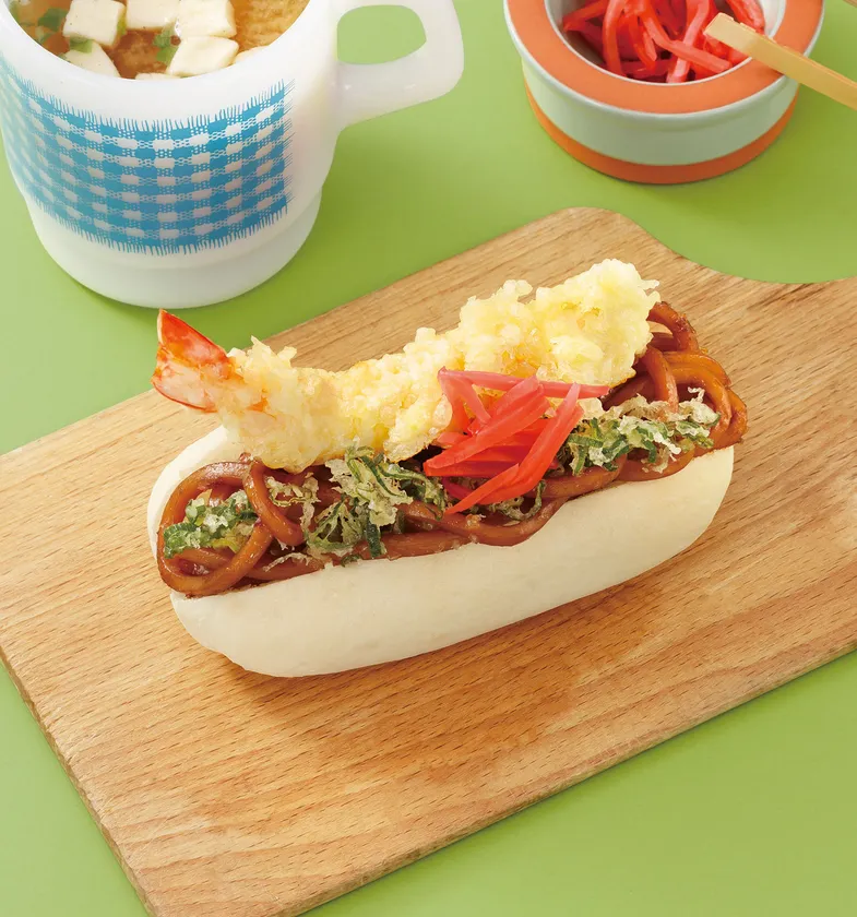 たまり醤油味の焼うどん、えび天ぷら、九条ネギの天ぷら、紅生姜を挟んだ限定パン。パンも、うどんとの相性を考え国産小麦や米粉を使ったパンを使用しています。