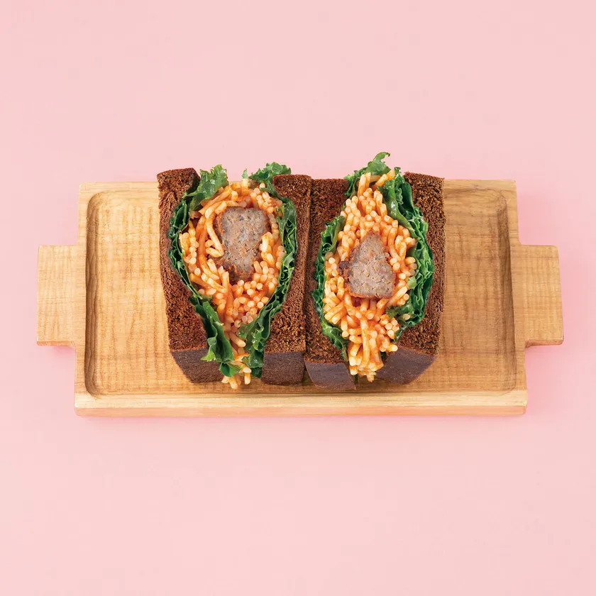 日本橋で創業75年の洋食屋が手掛ける、しっかりとした肉感を楽しめる牛タンミートボールと昔懐かしいナポリタンをサンド。ふんわりとした黒パンはお店のオリジナル。