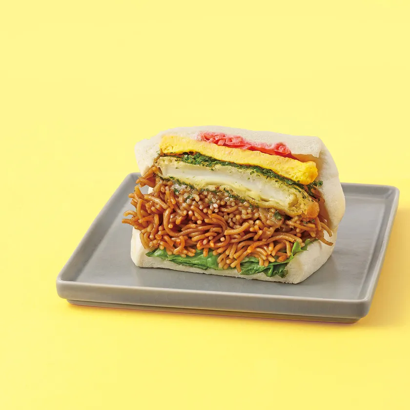 大人気の焼きそばサンドに、オムレツ・鰹節・紅生姜・青のり風味のイカ天などお好み焼き風の具材を挟んでいます。ボリューム感のある惣菜をワンハンドで食べられるサンドイッチ。