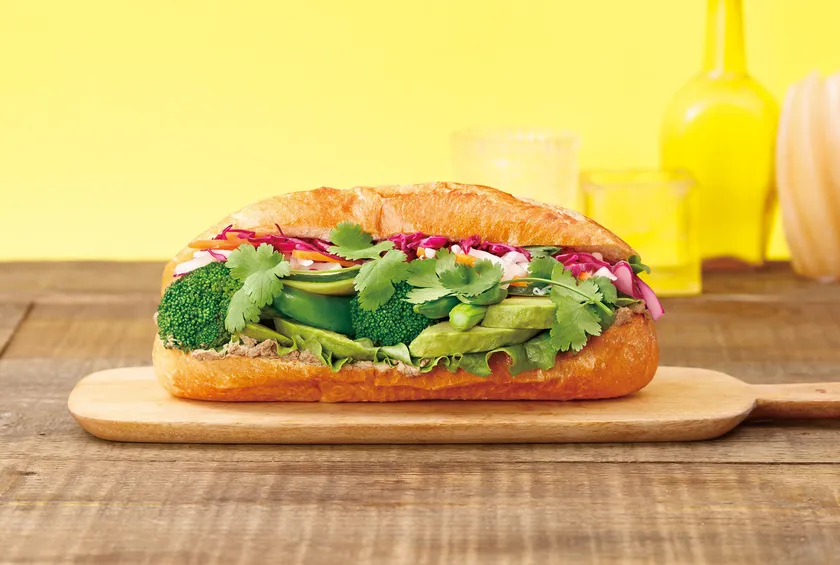 バインミー専用の自家製フランスパンに鶏のレバーペーストと旬のアスパラガスやスナップエンドウなどの春野菜がもりもり。紫キャベツも入ってカラフルな色合いでインスタ映えします。