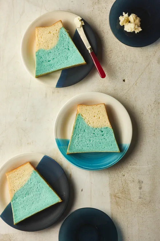 富士山の形をした可愛らしい食パン。山梨県産小麦かいほのか、ふじがね高原牛乳、青い部分には県内産巨峰ジュースなど使用。