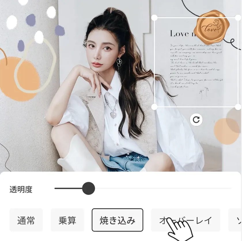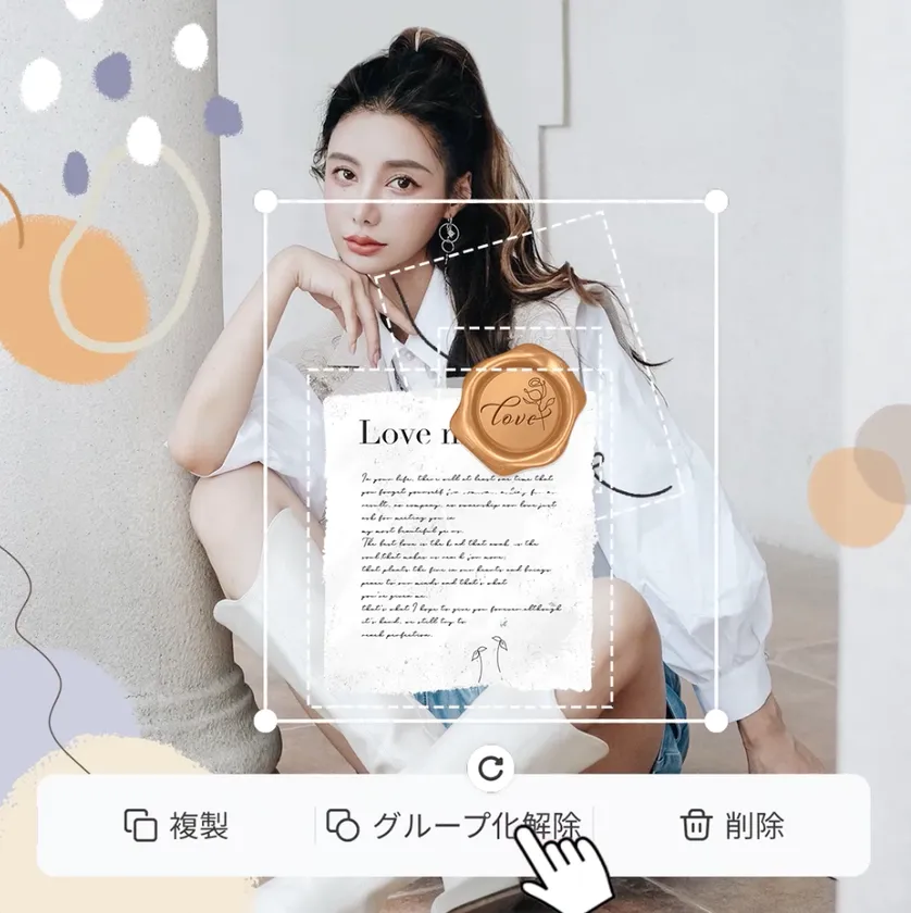 素材を長押しして複数のレイヤー素材を選択すると、グループ化が可能です。グループ化した素材はまとめて移動、ズーム、スタイルの編集を行うことができます。