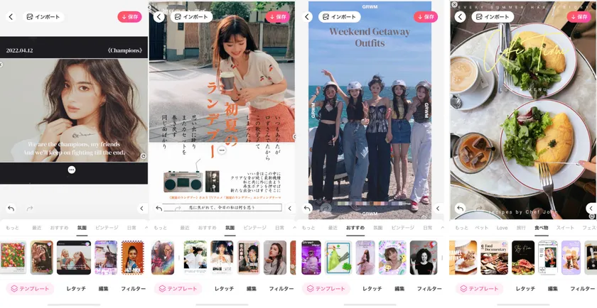 左からフィルム風、昭和の広告風、コーディネート写真用、食べ物用など、あらゆるシチュエーションや好みに合わせてテンプレートを使用することができる。