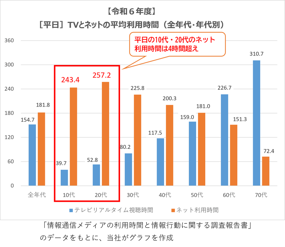 総務省情報通信政策研究所が2025年7月に発表した「情報通信メディアの利用時間と情報行動に関する調査報告書」によると、10代・20代のインターネットの平均利用時間は、平日では4時間超、休日には5時間超えと、他の年代に比べて非常に長いことが伺えます。