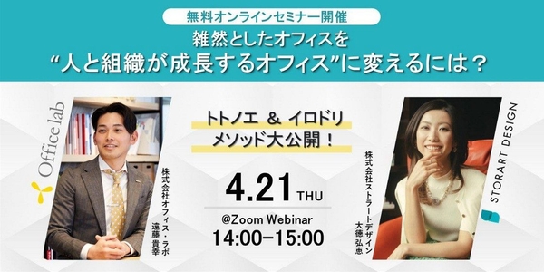 ”オフィスの片づけ・ファイリングの専門家”としてオフィス空間ブランディングを行う株式会社ストラートデザイン(本社:東京都江東区、代表取締役:大德弘恵、以下当社)は、オフィス移転プロジェクトをトータルプロデュースする、株式会社オフィス・ラボ(本社:東京都中央区、代表取締役:渡邉 晃一郎、以下当社)と共同で、2022年4月21日(木)14時〜15時に無料セミナー「雑然としたオフィスを、人と組織が成長するオフィスに変えるには?」を開催いたします。