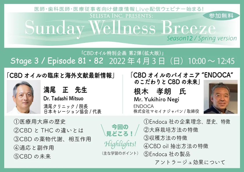 セリスタ株式会社(東京都千代田区、代表取締役:伊藤 承正)は、2022年4月3日(日)に、満尾 正先生(満尾クリニック/院長、日本キレーション協会/代表)と根木 孝朗氏(ENDOCA・株式会社マセイナジャパン/取締役)を講師に迎え、医師・歯科医師・薬剤師・医療従事者限定無料Zoomオンラインセミナー『CBDオイル特別企画第2弾(拡大版)』を開催します。