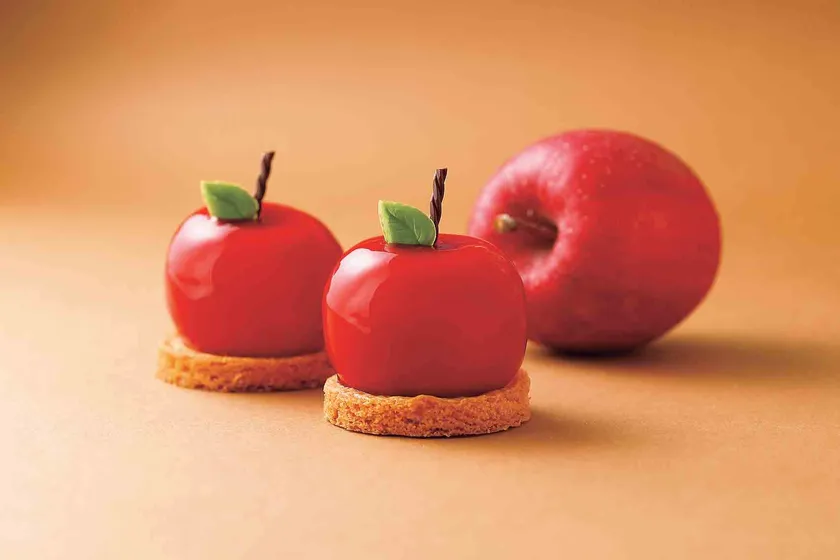 ショコラとリンゴのムースに真っ赤なグラサージュ※がかかったスイーツ。大きさは直径約6cm。(※表面に艶を出すために行う調理法)