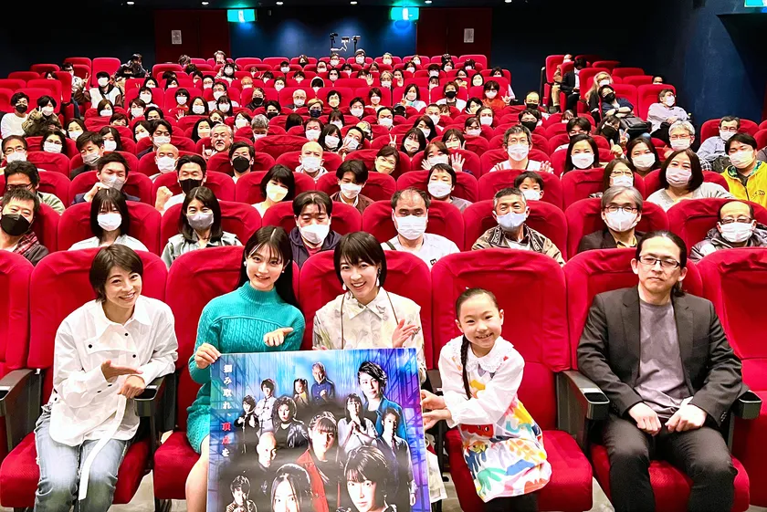 3月27日の舞台挨拶ではダブル主演の守谷菜々江と眞嶋優に加え、竹井咲希(子役)、浅井星光、柿原利幸監督が登壇しました。舞台挨拶終了後には観客の皆さまとの記念撮影も行いました。