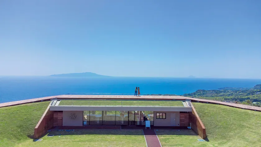 また、小室山山頂には令和3年4月に「小室山リッジウォーク“MISORA”」が新設され、おしゃれな「Cafe・321」も併設されました。「小室山リッジウォーク“MISORA”」では、相模灘や伊豆諸島、天気が良ければ富士山などが一望できます。「Cafe・321」は、全席オーシャン&スカイビュー。地層をイメージした優しい色合いの店内や、カフェ利用者限定のウッドデッキでくつろぐことができます。