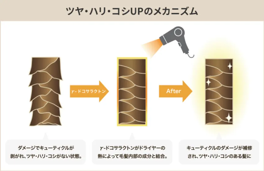 γ-ドコサラクトンは、キューティクルがはがれた毛髪の凹凸部分に特異的に吸着するという性質を持っています。ドライヤーの熱をうけることで、毛髪内部の成分と結合し毛髪ダメージを補修する働きがあります。