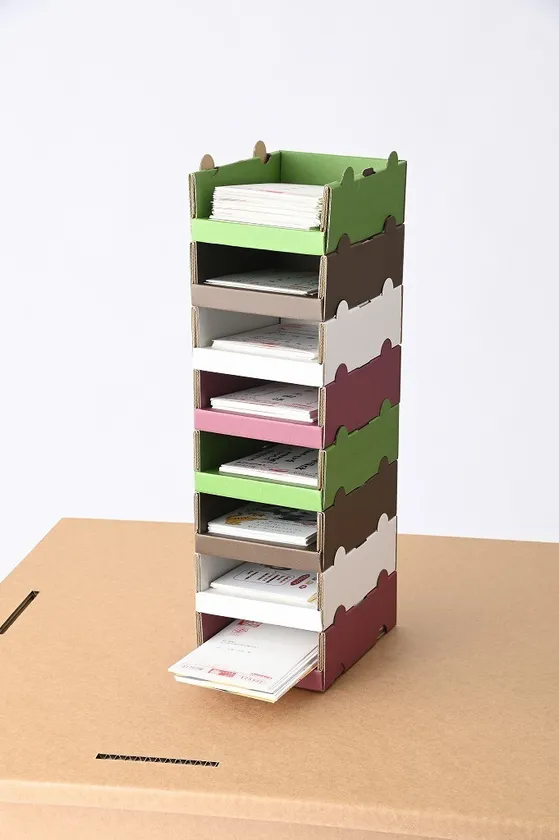 Eフルート(1.5mm厚)カラフル段ボールを使用。同部材のジョイントを使い、上にストックが可能(10段程度)。1つのツールには「はがき」ですと130枚程度は収納可能です。また、封筒や電卓も収納可能で何がどこに入っているか一目でわかる構造になっています。