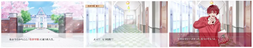 舞台は桜の花びらが舞い散る「色彩学校」。色彩検定合格に意気込む新入生の主人公は、チャイムを聞き、慌てて授業で使うテキストの確認をしようとした瞬間、誰かとぶつかってしまいます。