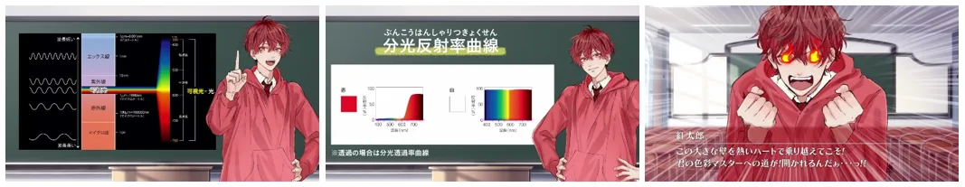 今回公開となる第1話「Lesson1.色とは?」では、CV梶裕貴さんによる熱血講師「紅太郎(こうたろう)」が、色彩の基礎について講義します。恋愛シミュレーションゲームのように、動画の主人公は視聴者ご自身であり、「色彩学園」に通う新入生として物語が進みます。