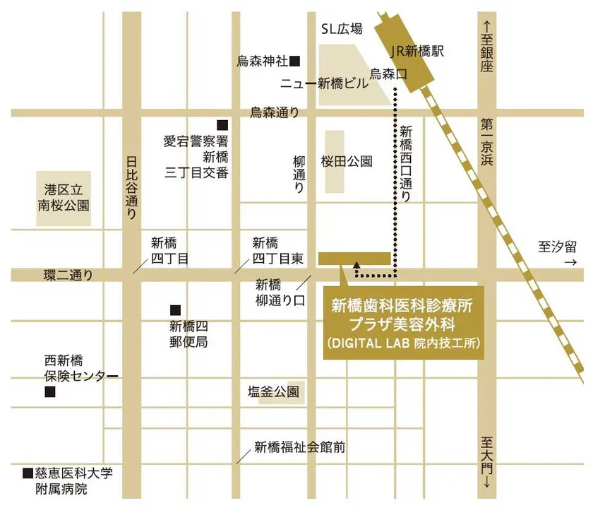DIGITAL LAB 院内技工所は、「新橋歯科医科診療所 プラザ美容外科」の院内に併設しています。