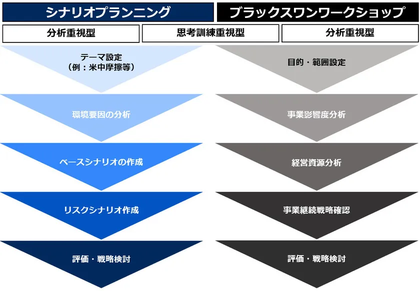 本サービスには「シナリオプランニング」と「ブラックスワンワークショップ」の2種類の進め方があります。