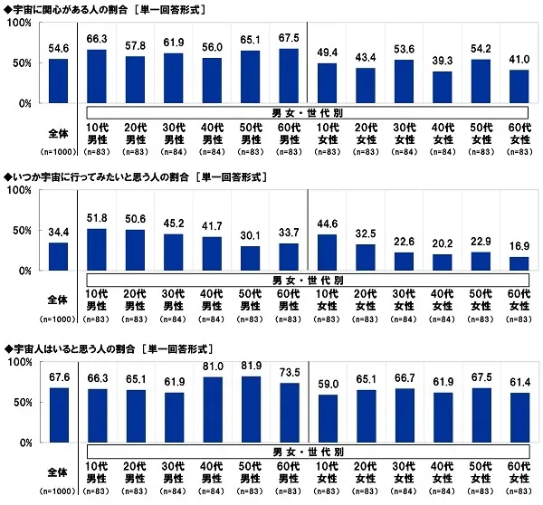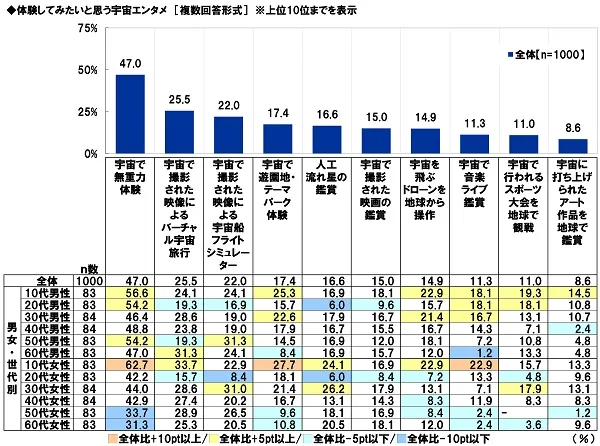 男女・世代別にみると、10代女性では、「宇宙で無重力体験」(62.7%)や「宇宙で遊園地・テーマパーク体験」(27.7%)、「宇宙で音楽ライブ鑑賞」(22.9%)が全体と比べて10ポイント以上高くなりました。