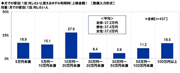 月での宿泊(1泊)をしたい人(437名)に、そうしたいと思えるホテル利用料(上限金額)を聞いたところ、「10万円~20万円未満」(27.9%)に最も多くの回答が集まったほか、「5万円未満」(16.9%)や「100万円以上」(16.5%)などにも回答がみられ、平均は37.2万円でした。