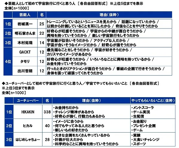 各芸能人を挙げた理由をみると、1位の「岩城滉一」では「トレーニングしているというニュースを見たから」「奇抜なことをやりそうだから」、2位の「明石家さんま」では「好奇心が旺盛そうだから」「宇宙からの中継が面白そうだから」、3位の「木村拓哉」では「宇宙服が似合いそうだから」「アクティブな人だから」、4位の「GACKT」では「最先端なことをしそうだから」「宇宙が好きそうだから」、「タモリ」では「いろいろなことに興味を持っているから」「お金を持っていそうだから」、「出川哲朗」では「行ったときのリアクションが面白そうだから」「番組の企画で行きそうだから」といった回答がありました。