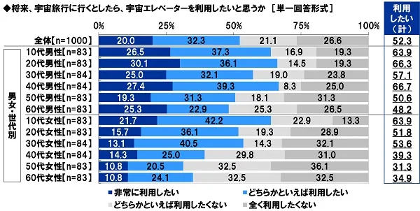また、将来、宇宙旅行に行くとしたら、宇宙エレベーターを利用したいと思うか聞いたところ、『利用したい(計)』は52.3%となりました。宇宙エレベーターは、地上と宇宙とをつなぐ輸送機関で、実現に向け近年研究・開発が進められています。
