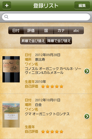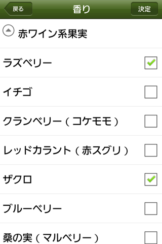 (1) ワインの特徴を感じるままに、タップ操作で記録する事ができ、色、香り、味わい、合わせたい料理等を、内蔵のデータベースから簡単に記入することができます。また、マイリスト機能により、お気に入りのコメントワードをデータベースに追加する事でカスタマイズ可能です。