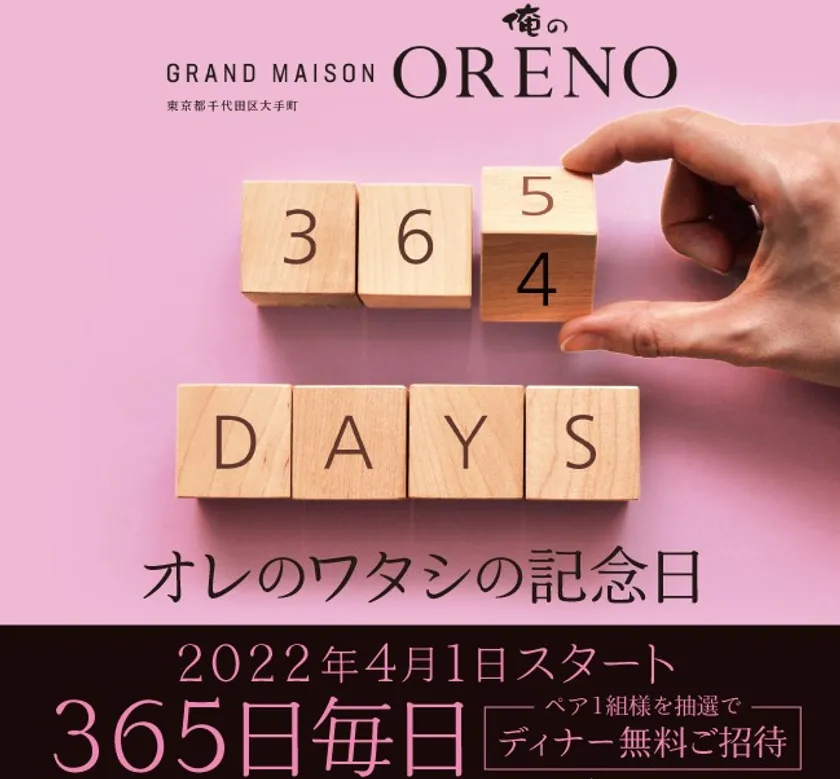 俺の株式会社(所在地:東京都中央区、代表取締役社長:木場 亮太)は、2022年5月1日より1年間、毎日ペア1組様を抽選で『Grand Maison ORENO by俺のフレンチ』(東京都千代田区大手町)に無料ご招待する『オレのワタシの記念日』特別企画の受付を4月1日より、いよいよスタートします。