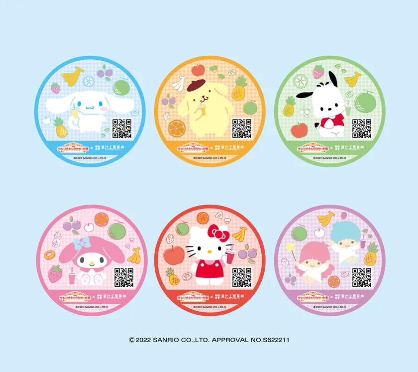対象商品1杯購入で限定コースターを1枚プレゼントいたします。デザインは全6種類で、フルーツとジュースに囲まれたサンリオキャラクターズがとても可愛いデザインです。 ※ランダム配付です。絵柄は選べません。