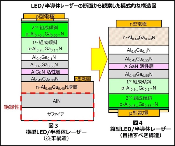 この問題を解決するためには、図4に示すようにpn接合に対してp電極とn電極を対向配置した縦型デバイスの開発が必要でしたが、本研究グループがレーザーリフトオフ法を用いてUV-B LEDやUV-B半導体レーザーの開発に成功しています。(プレスリリース2023年10月17日配信