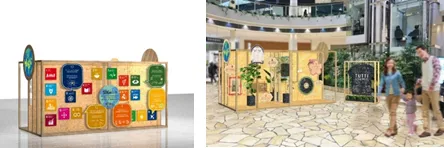 SDGsおよび「TUTTI」の紹介パネルを設置。見るだけでなく、触って体験することで、小さなお子様も一緒に学べる仕掛けのある展示を設置いたします。また、展示物には間伐材を使用し、再利用できる工夫をしています。