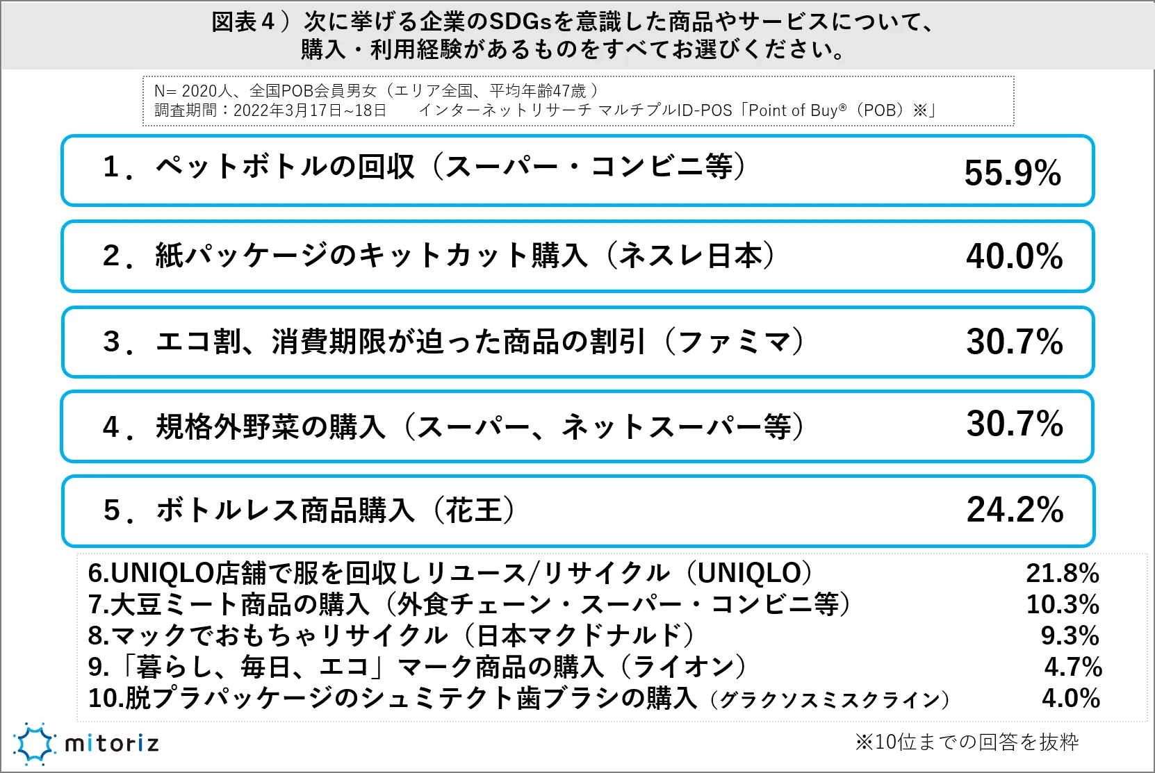 他にも、利用経験のあるSDGsを意識した商品やサービスとしては、「紙パッケージのキットカット購入(ネスレ日本)」(40.0%)、「エコ割、消費期限が迫った商品の割引(ファミリーマート)」(30.7%)、「規格外野菜の購入(スーパー、ネットスーパー)」(30.7%)、「ボトルレス商品購入(花王)」(24.2%)が上位回答となりました。