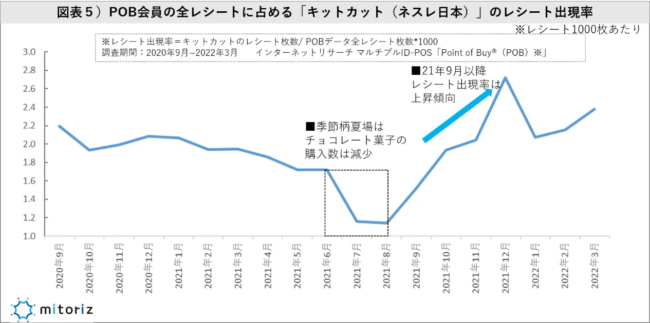 上図は、2020年9月~2022年3月における「POB会員の購入レシート全枚数」に占める、「キットカットのレシート出現率」を図表化したものです。※毎月の購入レシート全枚数が異なるため、レシート1000枚あたりの出現率で分析。