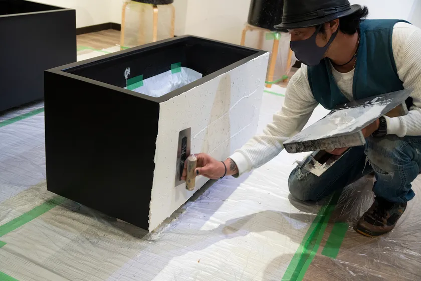 マテリアルプランターは株式会社アートモリヤ 藍左師 守谷 玲太氏と協働で進めているプロダクト制作です。日本の伝統「藍」と現代左官を融合させ独自の技法でアート作品や建築を手がけられている守谷氏。自然にある素材を生かし人々の繋がりを大切にした活動をされています。