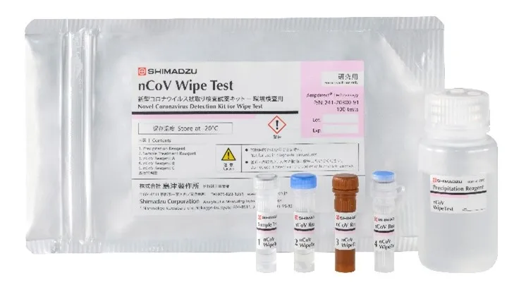 物質の表面に付着している新型コロナウイルスをPCR検査法によって簡便、迅速、高感度に検出するものです。「ノロウイルス拭取り検査用試薬キット」(2016年発売)で培ったウイルス濃縮技術と、検査の省力化や検出時間の短縮、検査コストの低減を目的に島津製作所独自の遺伝子増幅技術「Ampdirect(R) 技術」を適応し、2020年4月20日に発売した「新型コロナウイルス検出試薬キット」(研究用)を組み合わせ、新型コロナウイルスの感染拡大防止を目的とする衛生管理・安全確認に用いる試薬キットとして製品化しました。
