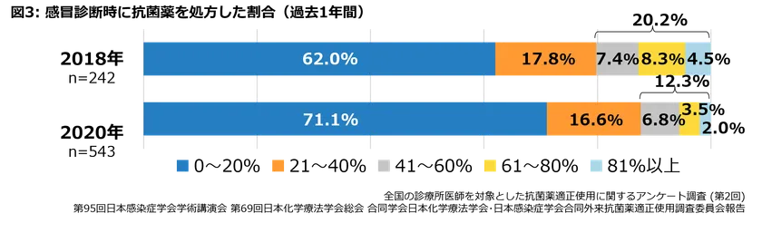 全国の診療所医師を対象とした調査では、感冒患者の41%以上に抗菌薬を処方する医師が20.2%から12.3%に減少していました(図3)。抗菌薬使用量の変化などからも、AMR対策が医療従事者の間に少しずつ浸透しているものと考えられます。