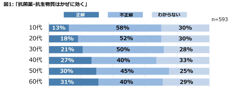AMR臨床リファレンスセンターが2021年に行った調査では、[抗菌薬・抗生物質はかぜに効く]を間違いと正しく回答した人の割合は、昨年と変わらなかっただけでなく、若い人ほど正しい知識を持つ割合が低いことがわかりました(図1)。