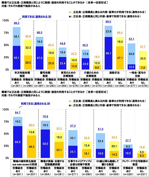 職場にある制度・施設について、「正社員・正規職員と同じ内容・基準で利用できる(適用される)」と「正社員・正規職員と異なる内容・基準だが利用できる(適用される)」を合計した『利用できる(適用される)計』をみると、調査項目中で高くなったのは「通勤手当」(74.5%)や「年次有給休暇制度」(69.6%)、「職場の福利厚生施設(食堂・休憩所・更衣室等)の利用」(67.3%)で7割前後となりました。厚生労働省の「同一労働同一賃金ガイドライン」に記載があるにもかかわらず、均等・均衡待遇が確保されていないことがわかりました。他方、調査項目中で低くなったのは休業制度やテレワーク・在宅勤務制度で、「育児のための休業制度」は30.4%、「介護のための休業制度」は24.2%、「テレワークや在宅勤務の制度」は17.6%にとどまりました。