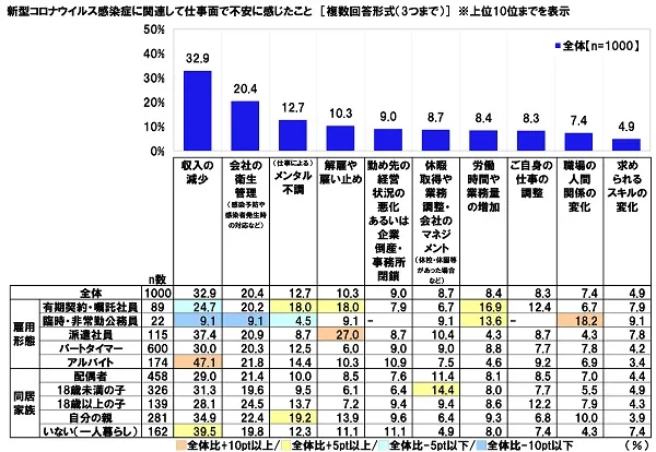 全回答者(1,000名)に、新型コロナウイルス感染症に関連して仕事面で不安に感じたことを聞いたところ、「収入の減少」が最も多く32.9%、次いで、「会社の衛生管理(感染予防や感染者発生時の対応など)」が20.4%、「(仕事による)メンタル不調」が12.7%、「解雇や雇い止め」が10.3%となりました。新型コロナウイルス感染拡大によって収入不安を感じた人が多いようです。