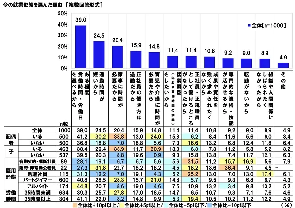 全回答者(1,000名)に、今の就業形態(非正規雇用)を選んだ理由を聞いたところ、「ある程度労働時間・労働日を選べるから」が最も多く39.0%、次いで、「通勤時間が短いから」が24.5%、「家事に時間が必要だから」が20.4%、「正社員の働き方は過酷だから」が15.9%、「育児や介護に時間が必要だから」が14.8%となりました。