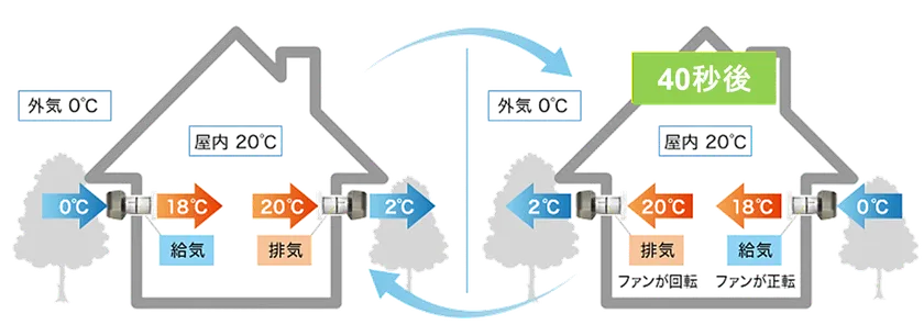 熱交換換気は、換気の際に外気を室温に近づけて取り入れることでエアコンの負荷を軽減、冷暖房費が節約できる画期的なシステムです。