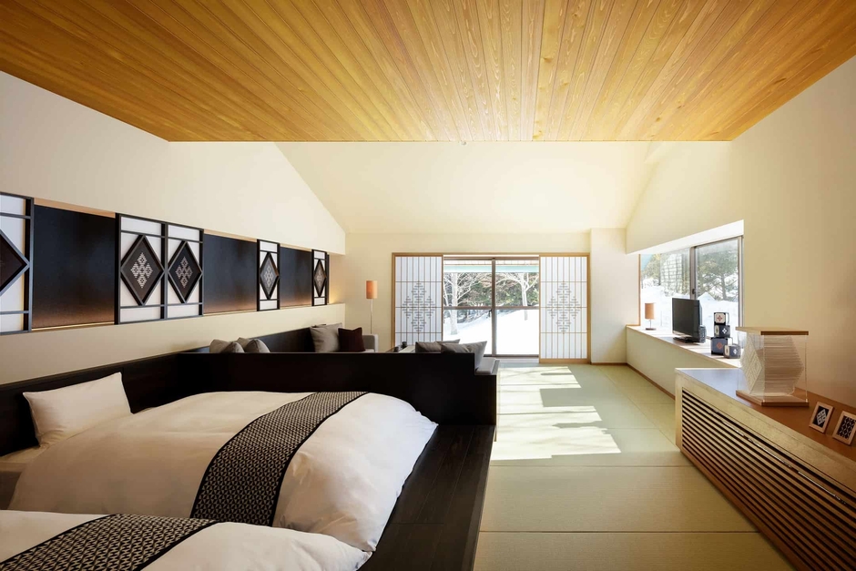 津軽地方発祥の伝統工芸「津軽こぎん刺し」。その美しいシンメトリーな模様はレトロにもモダンにもアレンジでき、現代の生活に溶け込みます。界 津軽では、青森県出身のkoginアーティスト・山端家昌氏のプロデュースにより、こぎん刺しの魅力をふんだんに盛り込んだ「津軽こぎんの間」を用意しています。障子や掛け軸、行灯など、いたるところにこぎん刺しを取り入れています。