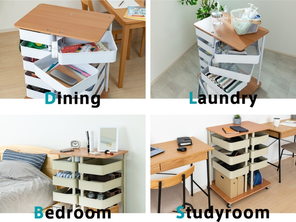 スペースが限られたお部屋の中でも用途に合わせた収納を組み合わせることでワゴン1台でコンパクトにまとめることができます。