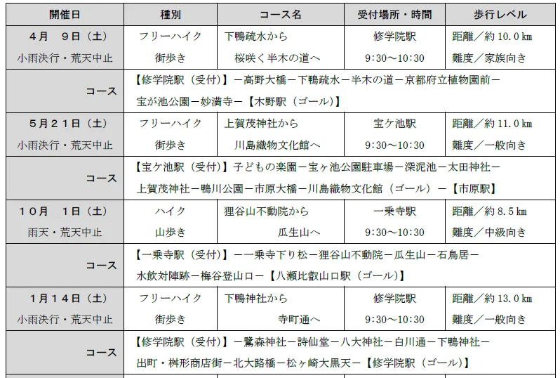 初回は4月9日(土)の開催を予定しており、修学院駅をスタートし、桜を鑑賞しながら歩く街歩きコース「下鴨疏水から桜咲く半木の道へ」を実施いたします。